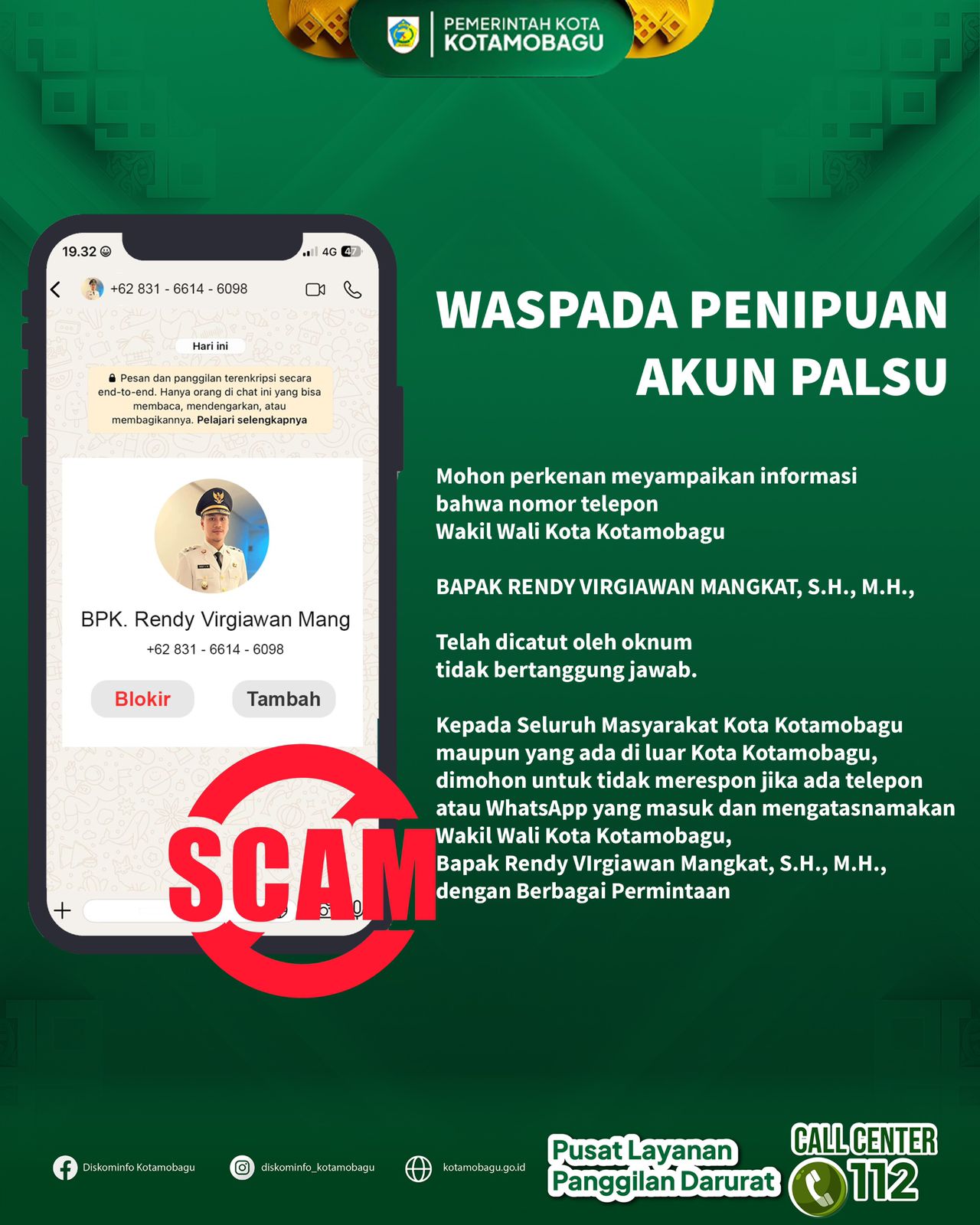 DetailNews.id, Kotamobagu – Aksi penipuan dengan mencatut nama Wakil Wali Kota Kotamobagu, Rendy Virgiawan Mangkat, dilaporkan mulai marak. Masyarakat pun diminta meningkatkan kewaspadaan terhadap berbagai modus yang dilakukan oleh oknum tidak bertanggung jawab.