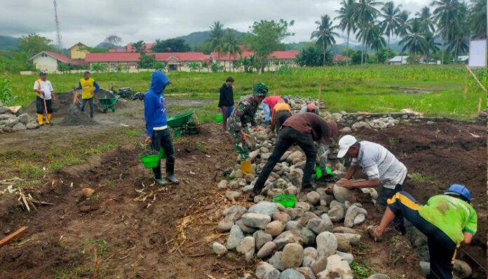 Pada kegiatan hari tersebut, progres pembangunan meliputi pengumpulan material batu dan pasir, pembuatan boplang, serta pemasangan pondasi awal. Hingga saat ini, capaian pembangunan tercatat mencapai 3,52 persen. Proses pengerjaan dilakukan secara gotong royong dengan melibatkan 13 warga setempat serta didukung oleh 2 personel TNI, yang mencerminkan kuatnya sinergi antara TNI dan masyarakat.