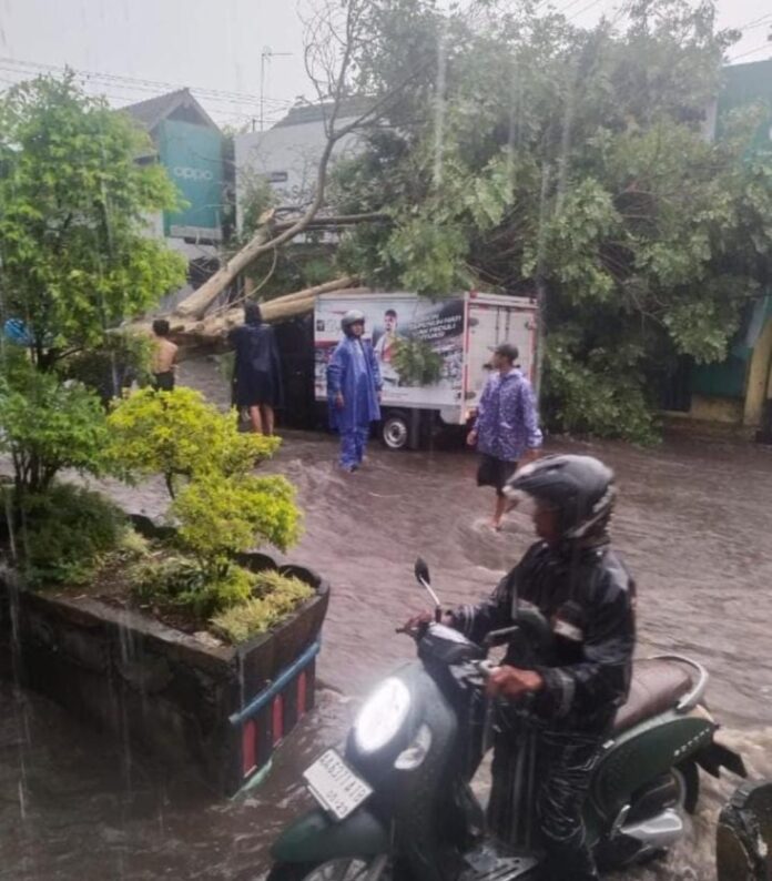 Akibat peristiwa itu menyebabkan sejumlah pohon tumbang di tengah jalan sampai menutup arus transportasi.
