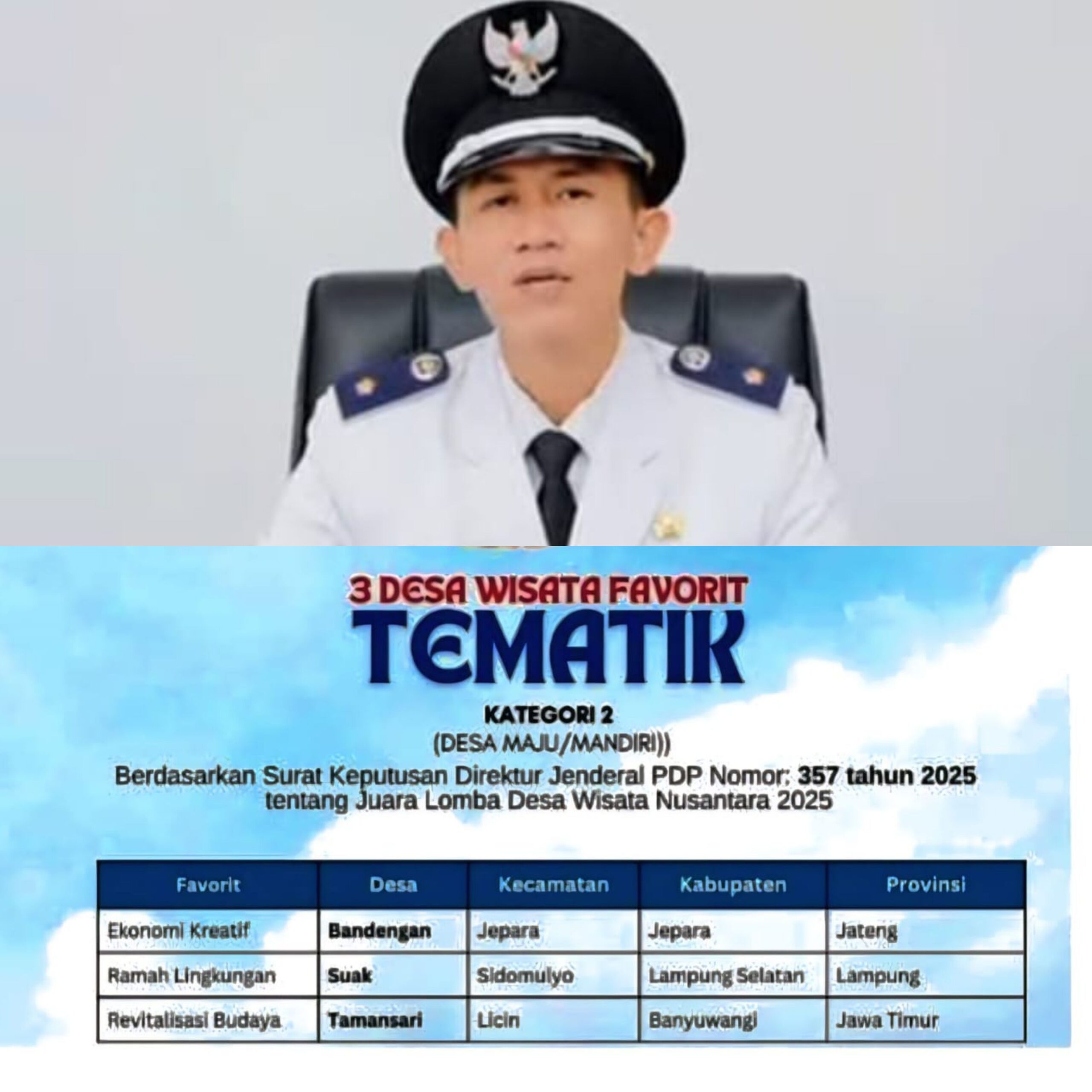 DetailNews.id, Lampung Selatan – Desa Suak, Kecamatan Sidomulyo, Kabupaten Lampung Selatan resmi dinobatkan sebagai Desa Wisata Favorit Tematik Ramah Lingkungan pada Lomba Desa Wisata Nusantara Tahun 2025. Penetapan tersebut diumumkan melalui Surat Direktorat Jenderal Pembangunan Desa dan Perdesaan Kementerian Desa, Pembangunan Daerah Tertinggal, dan Transmigrasi Republik Indonesia dengan Nomor B-279/PDP.00/XI/2025 tanggal 12 November 2025.