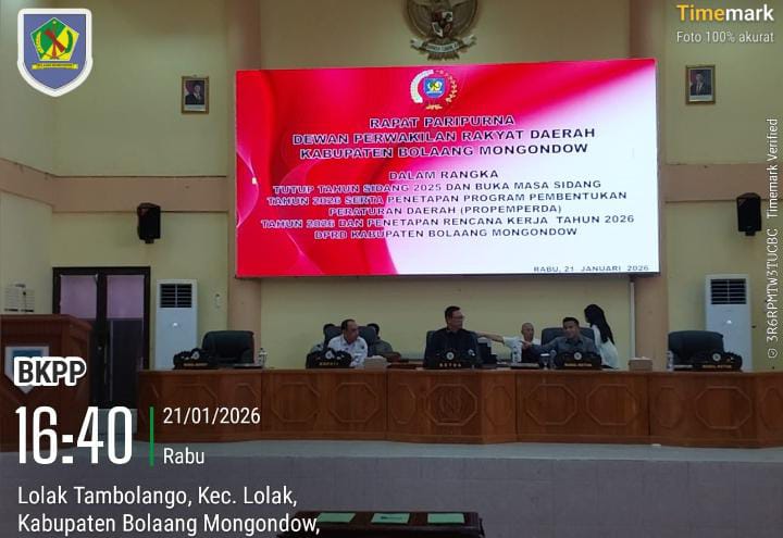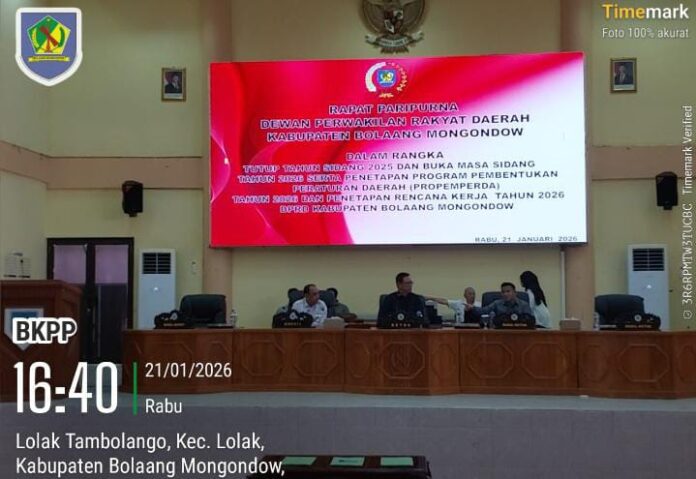 DetailNews.id, Bolmong – Dipimpin Ketua DPRD Tonny Tumbelaka, DPRD Kabupaten Bolaang Mongondow menggelar rapat paripurna penutupan masa sidang tahun 2025 sekaligus pembukaan masa sidang tahun 2026, Rabu (21/1), dengan agenda utama penetapan Propemperda dan RKT DPRD Tahun 2026.