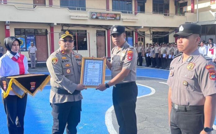 Daalm apel yang digelar di Lapangan Mako Polres Tarakan, Senin (23/2/2026) pagi, Kapolres Tarakan AKBP Erwin S Manik, SH., S.IK., MH., diwakili Wakapolres Tarakan, Kompol Bobi Vaski Pranata, menyerahkan Piagam Penghargaan Kapolda Kaltara kepada dua personel berprestasi.