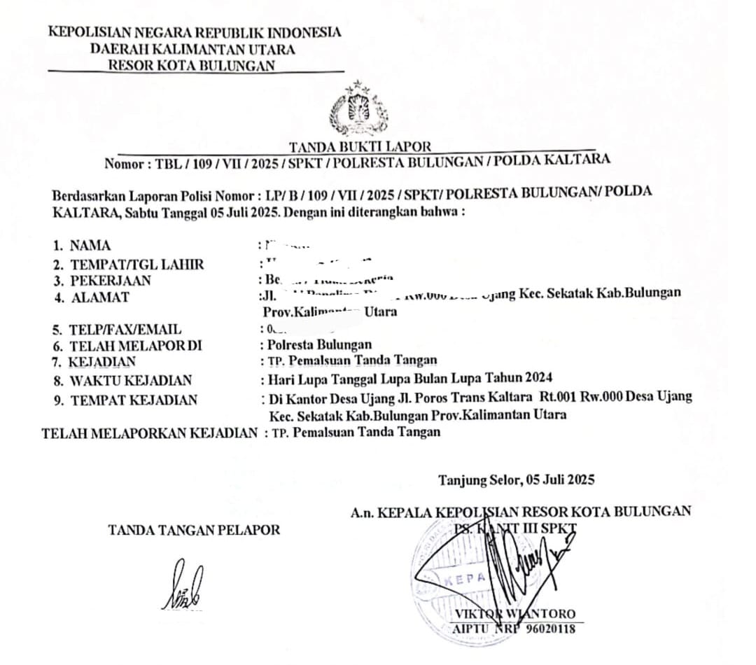 Diterima redaksi, berdasarkan Laporan Polisi Nomor: LP/B/109/VII/2025/SPKT/Polresta Bulungan/Polda Kaltara, dugaan pemalsuan tanda tangan tersebut dilaporkan terjadi pada tahun 2024 di Kantor Desa Ujang, Jalan Poros Trans Kaltara, RT 001 RW 000, Desa Ujang, Kecamatan Sekatak.