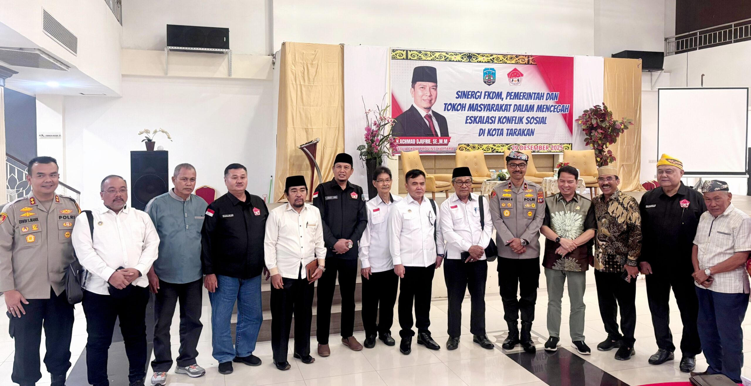 DetailNews.id, Tarakan — Forum Kewaspadaan Dini Masyarakat (FKDM) Kalimantan Utara bersama Kepolisian Daerah (Polda) Kaltara, menggelar Dialog Publik bertema “Sinergi FKDM, Pemerintah, dan Tokoh Masyarakat dalam Mencegah Eskalasi Konflik Sosial” di Hotel Lotus Panaya, Tarakan, Senin (29/12/2025).