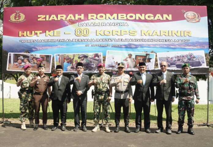 DetailNews.id, Bitung – Wali Kota Bitung, Hengky Honandar, SE, bersama jajaran Forum Koordinasi Pimpinan Daerah (Forkopimda) menghadiri Upacara dan Ziarah dalam rangka peringatan Hari Ulang Tahun ke-80 Korps Marinir TNI AL, yang digelar secara khidmat di lapangan mako Yonmarhanlan VIII Bitung, Jumat (7/11/2025).