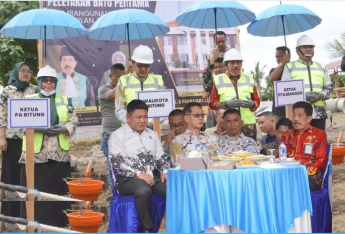 Prosesi peletakan batu pertama dilakukan secara simbolis oleh Ketua Pengadilan Tinggi Agama Manado bersama Wali Kota Bitung dan Wakil Wali Kota Bitung Randito Maringka, serta disaksikan unsur Forkopimda, tokoh agama, jajaran Pengadilan Agama Bitung, perwakilan Kementerian Agama, dan para undangan.