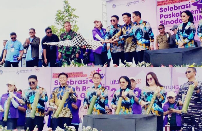 Selebrasi Paskah Remaja Sinode GMIM 2026 ini turut dihadiri Wali Kota Bitung Hengky Honandar bersama Ketua TP-PKK Bitung Ny. Ellen Honandar-Sondakh, Wakil Wali Kota Bitung Randito Maringka bersama Sekretaris TP-PKK Ny. Jacinta Maribel Maringka-Gumolung, jajaran pemerintah daerah, tokoh gereja, TNI-Polri, serta ribuan jemaat GMIM.