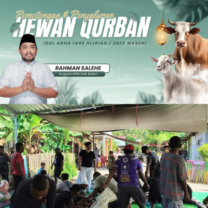 DetailNews.id — Dalam semangat Hari Raya Idul Adha 1446 Hijriah, Anggota DPRD Kabupaten Bolaang Mongondow Timur (Boltim), Rahman Salehe, menunjukkan komitmennya terhadap masyarakat dengan menyalurkan 600 paket daging kurban kepada warga di daerah pemilihannya, khususnya wilayah Kotabunan-Bulawan.