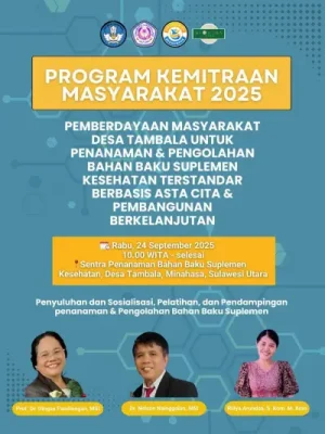 DetailNews.id – Sebuah terobosan penting kembali ditorehkan dunia akademik Indonesia, khususnya dari Universitas Sam Ratulangi (Unsrat) Manado. Tim peneliti dari kampus terkemuka di Sulawesi Utara ini berhasil mengimplementasikan hasil riset yang telah memperoleh paten berupa suplemen kesehatan berbasis bahan alam langsung kepada masyarakat melalui program pemberdayaan perempuan di Jaga VII, Desa Tambala, Kabupaten Minahasa.