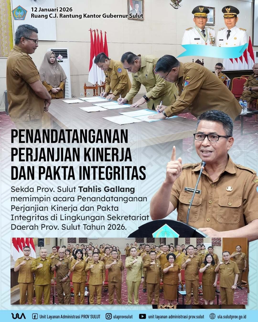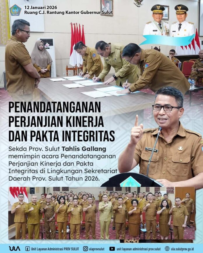“Penandatanganan perjanjian kinerja dan pakta integritas ini menjadi momentum awal bagi seluruh jajaran untuk menunjukkan kinerja yang maksimal, khususnya dalam pelayanan publik, sekaligus sebagai upaya pencegahan praktik korupsi, kolusi, dan nepotisme (KKN) di lingkungan Pemprov Sulut,” ujar Tahlis.