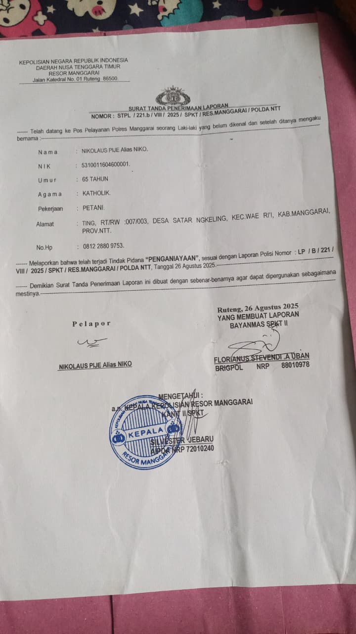 DetailNews.id, Manggarai – Penanganan kasus dugaan penganiayaan terhadap Kosmas Lindeng di Kampung Kaweng, Desa Bangka Kenda, Kecamatan Wae Ri’i, Kabupaten Manggarai, Nusa Tenggara Timur, mulai menunjukkan perkembangan. Kepolisian Resor (Polres) Manggarai menyatakan akan segera menggelar perkara menyusul desakan keluarga korban terkait belum ditahannya para terduga pelaku.