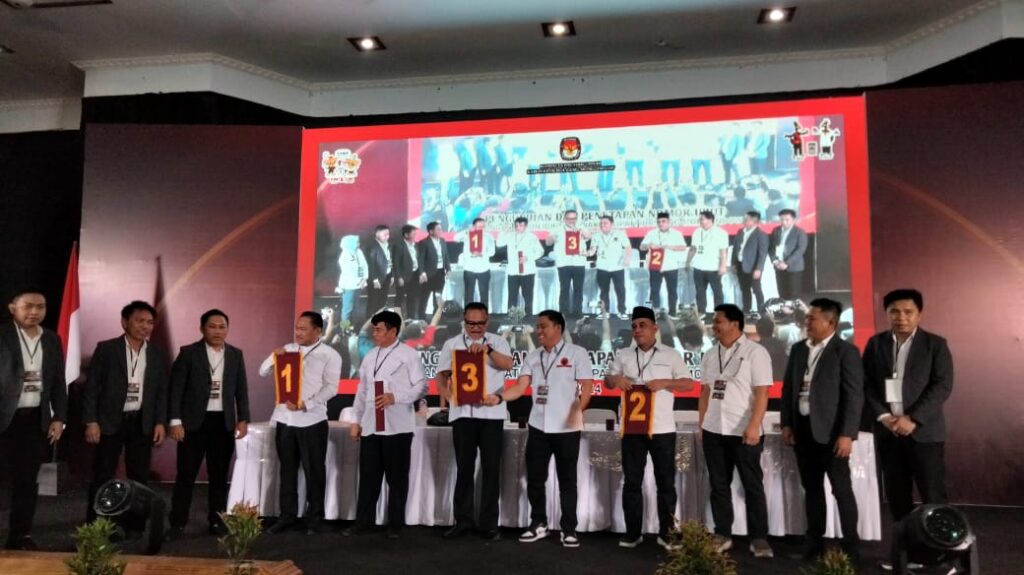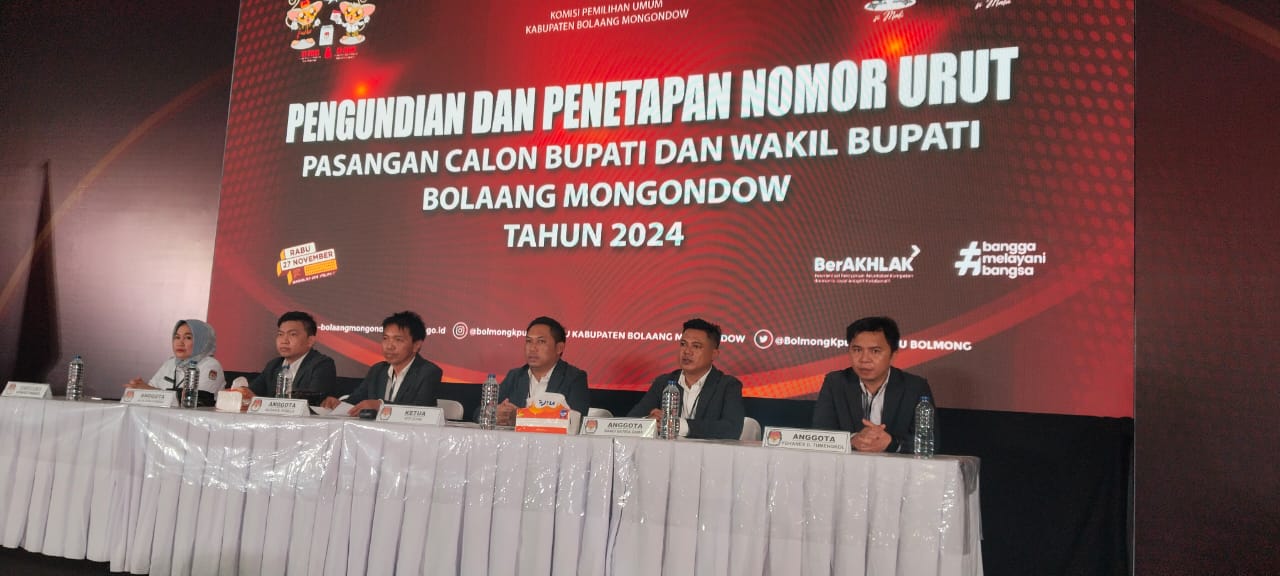“Pasangan Calon Yusra-Donny mendapatkan nomor urut 2, Limi-Welty nomor urut 3, dan Sukron-Refly nomor urut 1,” ujar Ketua KPU Bolmong Afif Zuhri, saat memimpin rapat pleno pengundian dan penetapan nomor urut.