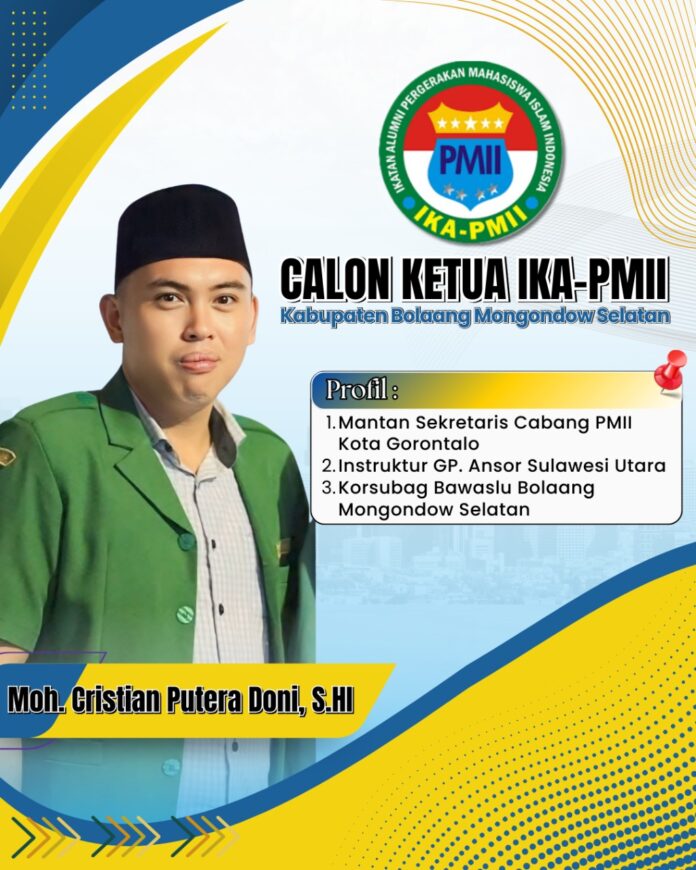 Moh. Christian P. Doni hadir sebagai salah satu calon kuat IKA PMII Kabupaten Bolaang Mongondow Selatan. Sosok muda yang matang dalam pengalaman organisasi ini pernah mengemban amanah sebagai Sekretaris Umum PC PMII Kota Gorontalo, kemudian berkembang menjadi Instruktur GP Ansor Sulawesi Utara, dan saat ini dipercaya menjabat sebagai Korsubag Bawaslu Bolsel.