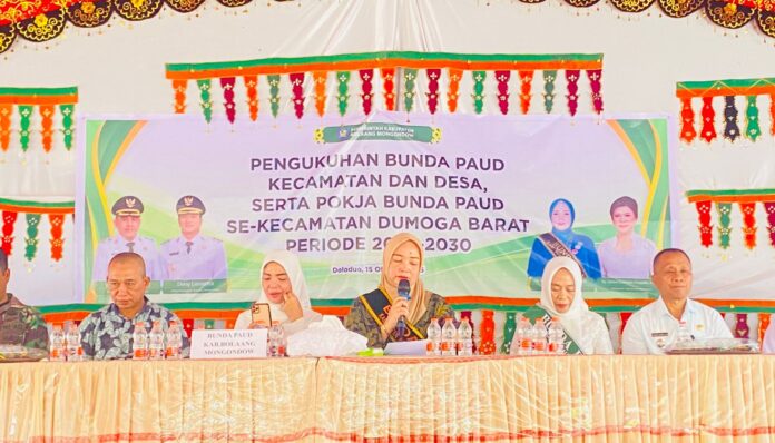 DetailNews.id – Ketua Tim Penggerak Pemberdayaan dan Kesejahteraan Keluarga (TP-PKK) Kabupaten Bolaang Mongondow, Ny. Kalsum Alhabsyi-Alhabsyi, resmi melantik Ketua TP-PKK Kecamatan sekaligus Bunda PAUD dari 12 desa se-Kecamatan Dumoga Barat. Kegiatan pelantikan berlangsung di halaman Kantor Kecamatan Dumoga Barat dan dihadiri berbagai unsur pemerintahan serta tokoh masyarakat, Selasa (15/10/2025).