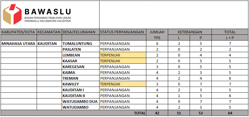 Renalta Slamet selaku Kordiv HP2H Juga menambahkan bahwa beberapa desa lain masih membutuhkan tambahan pengawas TPS. “Pendaftaran di Desa Paslaten, Tumaluntung, Karegesan, Kaima,Treman, Kauditan 1, Kauditan 2,Watudambo, dan Watudambo 2 akan diperpanjang hingga 10 Oktober 2024. Kami mengundang masyarakat yang memenuhi syarat untuk mendaftar dan ikut berkontribusi dalam menjaga integritas Pilkada 2024 di wilayah kita.”