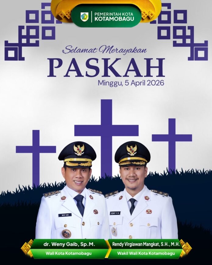 DetailNews.id, Kotamobagu – Wali Kota Wenny Gaib dan Wakil Wali Kota Rendy Virgiawan Mangkat menyampaikan ucapan selamat Hari Raya Paskah 2026, mengajak masyarakat meneladani kasih dan pengorbanan Kristus untuk memperkuat kebersamaan di Kota Kotamobagu.