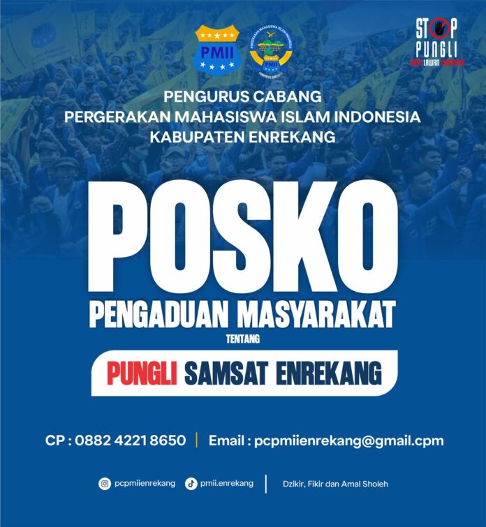 detailnews.id/Enrekang -Sebagaimana respon dari laporan Masyarakat yang mana ada dugaan pungli yang terjadi di Samsat Enrekang Pengurus Cabang Pergerakan Mahasiswa Islan Indonesia (PMII) Cabang Enrekang membentuk posko aduan Masyarakat sejak hari ini Rabu, 08 April 2026. Ketua PC PMII Enrekang Muhammad Hafiz mengatakan untuk mempermudah proses Advoasi tekait dugaan pungli di kabupaten Enrekang kami membentuk posko aduan, “saya rasa banyak di antara kita yang menjadi korban jadi kami membentuk posk, siapa pun bisa mengadu nanti nya terkait dugaan adanya pungli di kantor Samsat Enrekang,”