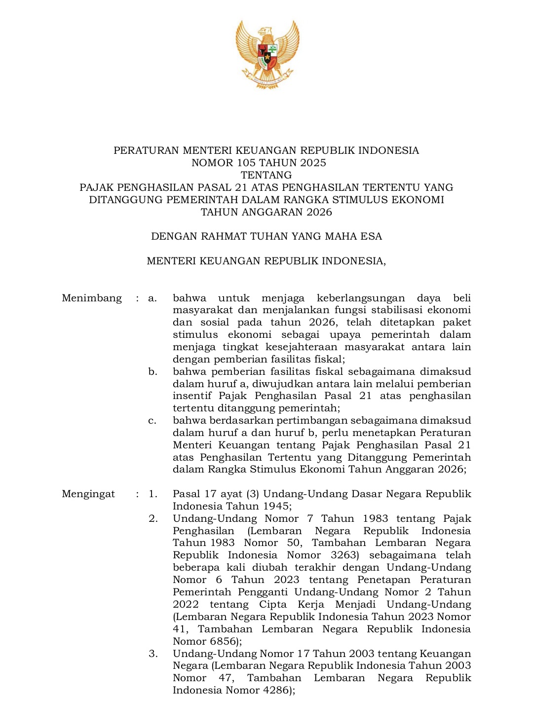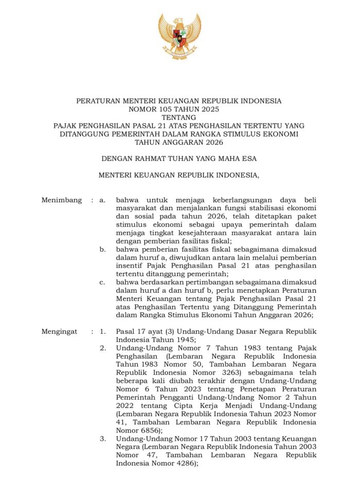 Kebijakan tersebut tertuang dalam PMK Nomor 105 Tahun 2025 yang ditetapkan pada tanggal 29 Desember 2025. PMK menegaskan PPh Pasal 21 Ditanggung Pemerintah (DTP) untuk pekerja di sektor alas kaki, tekstil dan pakaian jadi, furnitur, kulit dan barang dari kulit, serta pariwisata.
