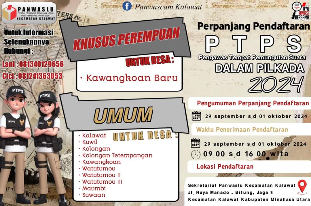 Pendaftaran dapat dilakukan dengan mengunjungi langsung Kantor Sekretariat Panwaslu Kecamatan Kalawat atau melalui kanal online yang telah disediakan. Diharapkan masyarakat dapat memanfaatkan waktu tambahan ini untuk berpartisipasi aktif dalam pengawasan Pemilu 2024.