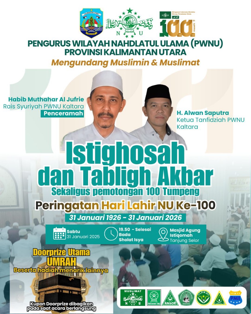 DetailNews.id, Tanjung Selor – Pengurus Wilayah Nahdlatul Ulama (PWNU) Provinsi Kalimantan Utara akan menggelar Istighosah dan Tabligh Akbar dalam rangka memperingati Hari Lahir (Harlah) Nahdlatul Ulama ke-100, pada Sabtu (31/1/2025) malam.