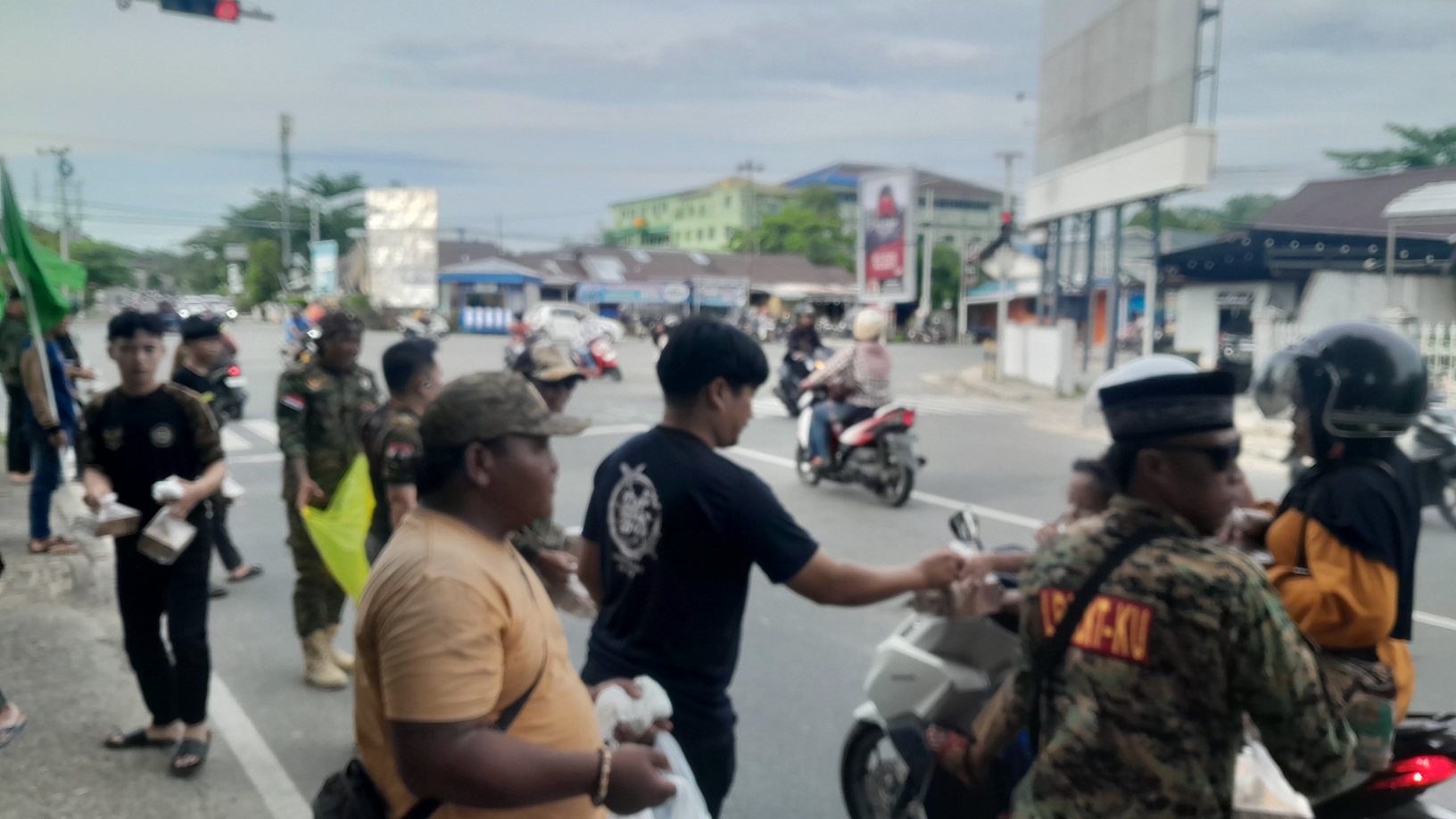 Dalam kegiatan tersebut, sekitar 1.000 paket takjil dibagikan kepada pengguna jalan yang melintas di simpang lampu merah Ladang.