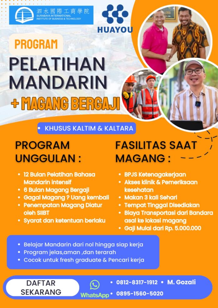 DetailNews.id, Tarakan — Surabaya International Institute of Business & Technology (SIIBT) bekerja sama dengan Huayou Indonesia membuka Program Pelatihan Bahasa Mandarin plus Magang Bergaji yang ditujukan khusus bagi masyarakat Kalimantan Timur (Kaltim) dan Kalimantan Utara (Kaltara).
