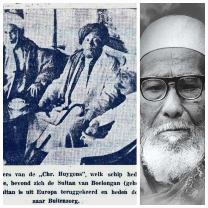 “Di antara penumpang “Chr. Huygens yang kapalnya tiba di Priok tadi pagi, adalah Sultan Boelongan (paling kanan) bersama rombongan. Sultan telah kembali dari Eropa dan hari ini berangkat ke Buitenzorg.”