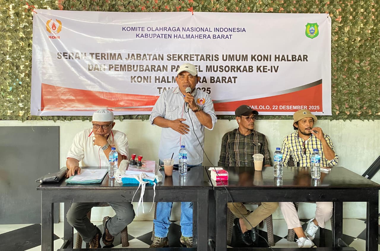 Pelantikan dan serah terima jabatan berlangsung di Caffe “Rumah Kopi”, Desa Acango, Jailolo, Senin (22/12/2025), yang dirangkaikan dengan pembubaran Panitia Musyawarah Olahraga Kabupaten (MUSORKAB) ke-IV KONI Halmahera Barat.
